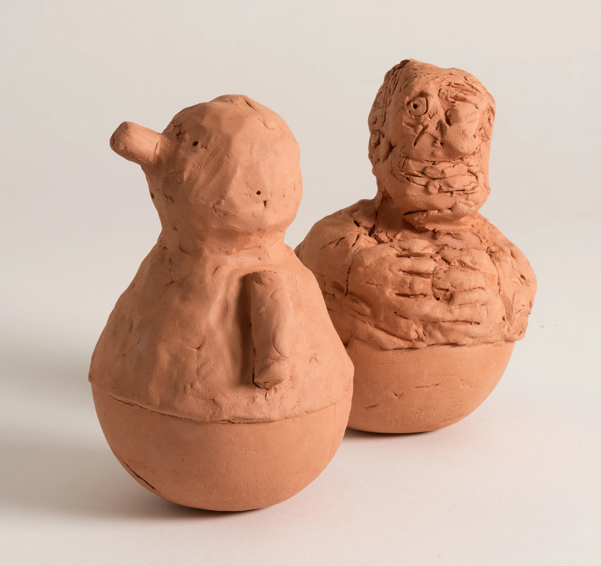 "These Two Men; an Encounter", 2018, each 9"x4"x3", painted low-fire clay